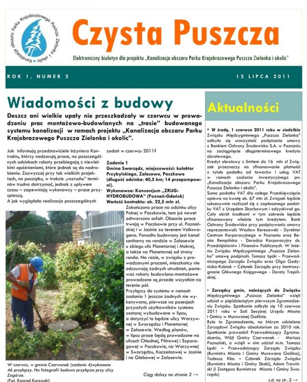Pojawił się drugi numer miesięcznika „Czysta Puszcza”. Elektroniczny biuletyn przeznaczony jest dla uczestników projektu „Kanalizacja obszaru Parku Krajobrazowego Puszcza Zielonka i okolic” po stronie inwestora.