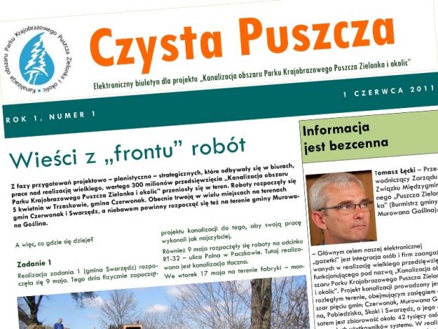 Pierwszy numer elektronicznego biuletynu zatytułowanego „Czysta Puszcza”, a traktującego o wszystkim co dzieje się wokół projektu „Kanalizacja obszaru Parku Krajobrazowego Puszcza Zielonka i okolic” ukazał się w środę 1 czerwca.