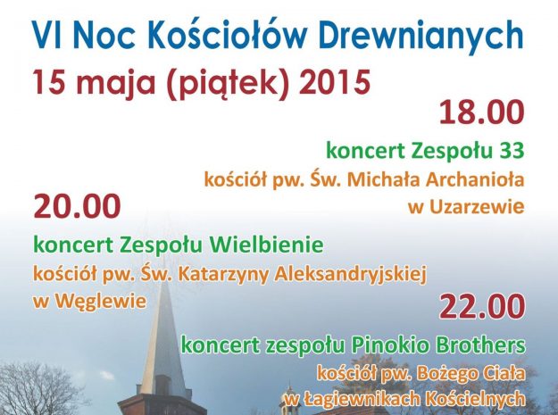 Kilkaset osób uczestniczyło w koncertach zorganizowanych w ramach VI Nocy Kościołów Drewnianych 15 maja 2015 roku. Muzyczna podróż po Szlaku Kościołów Drewnianych rozpoczęła się w Uzarzewie. W kościele pw. św. Michała Archanioła wystąpił zespół „33”. Drugi z koncertów odbył się w kościele pw. św. Katarzyny Aleksandryjskiej w Węglewie. Usłyszeć tu można było muzyków poznańskiej inicjatywy…